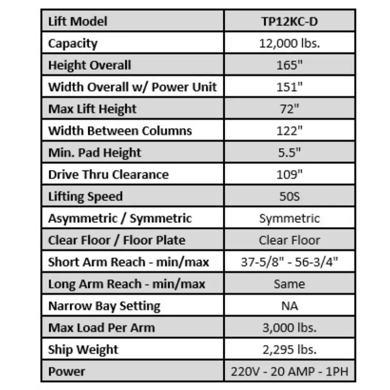 The Tuxedo TP12KC-D is built for the big job, big equipment, or big trucks. This clear floor truck lift has telescoping lift arms that extend between 37 5/8″ to 56 3/4″.